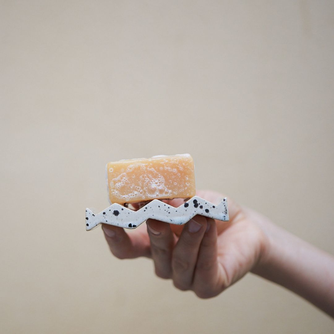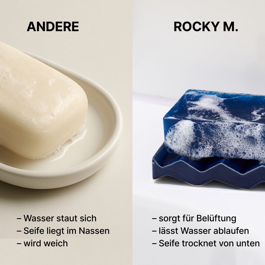 Die ROCKY M. Seifenschale hält deine Seife trocken und das Waschbecken sauber.