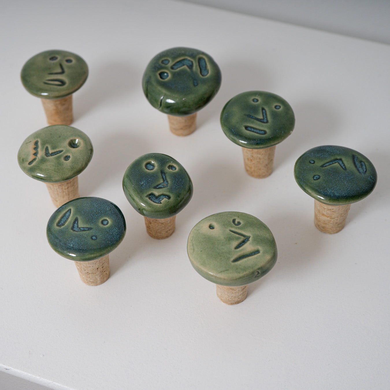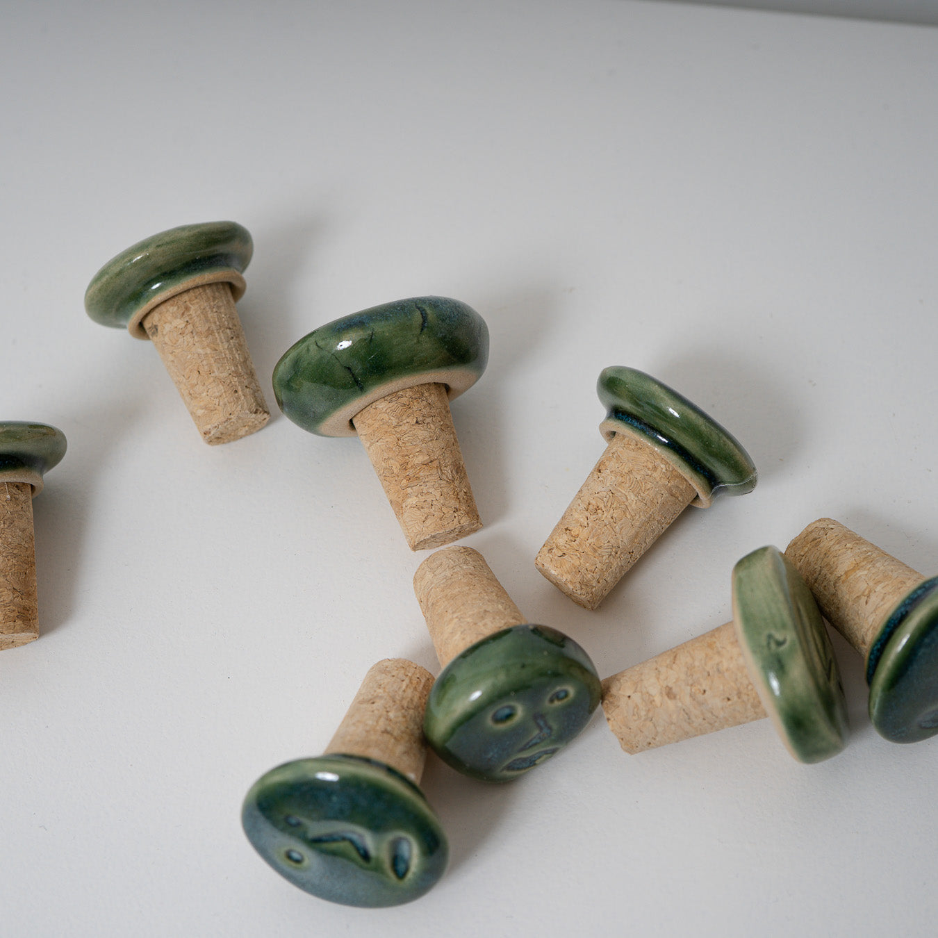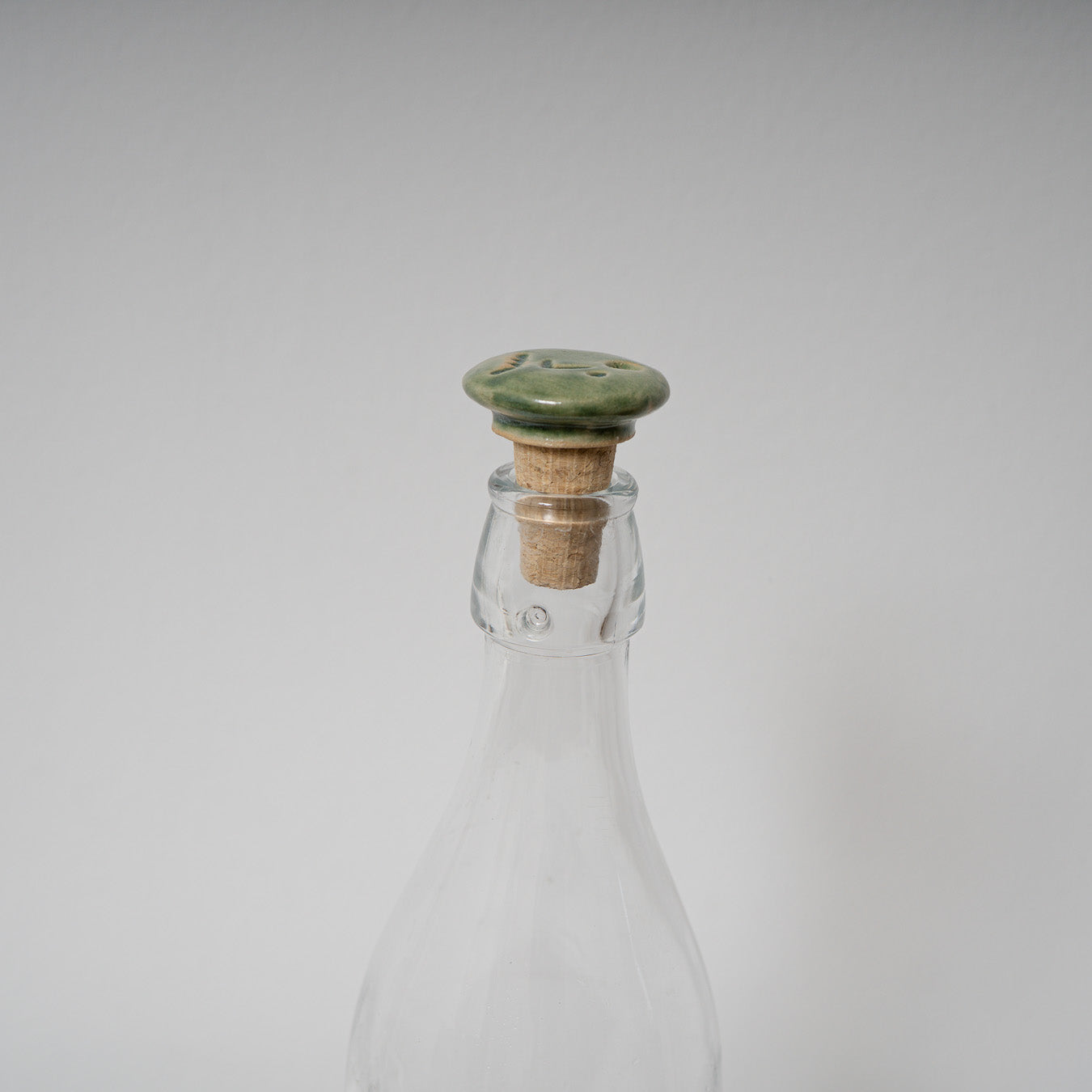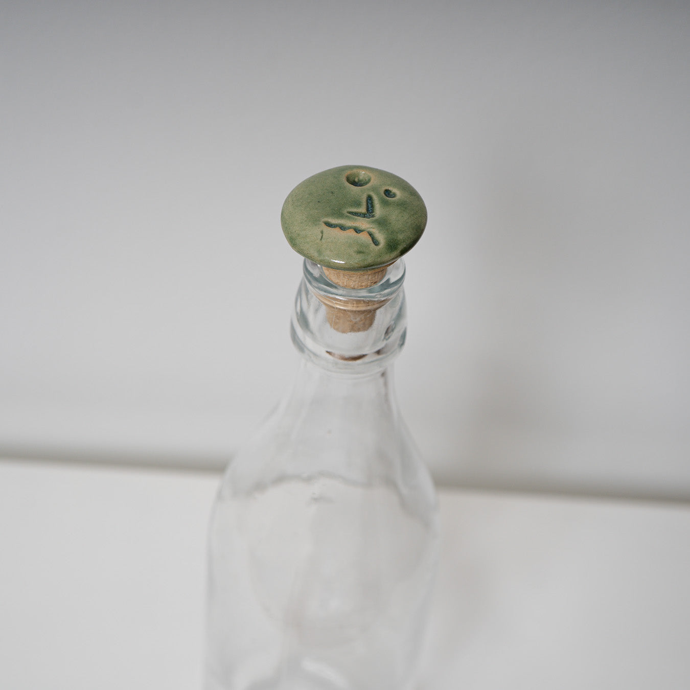 Ein keramisches Gesicht, handgeformt und auf einen hochwertigen Korken gesetzt, verschließt Wein-, Saft- oder Ölflaschen zuverlässig und bringt dabei eine leichte, freundliche Präsenz auf den Tisch.