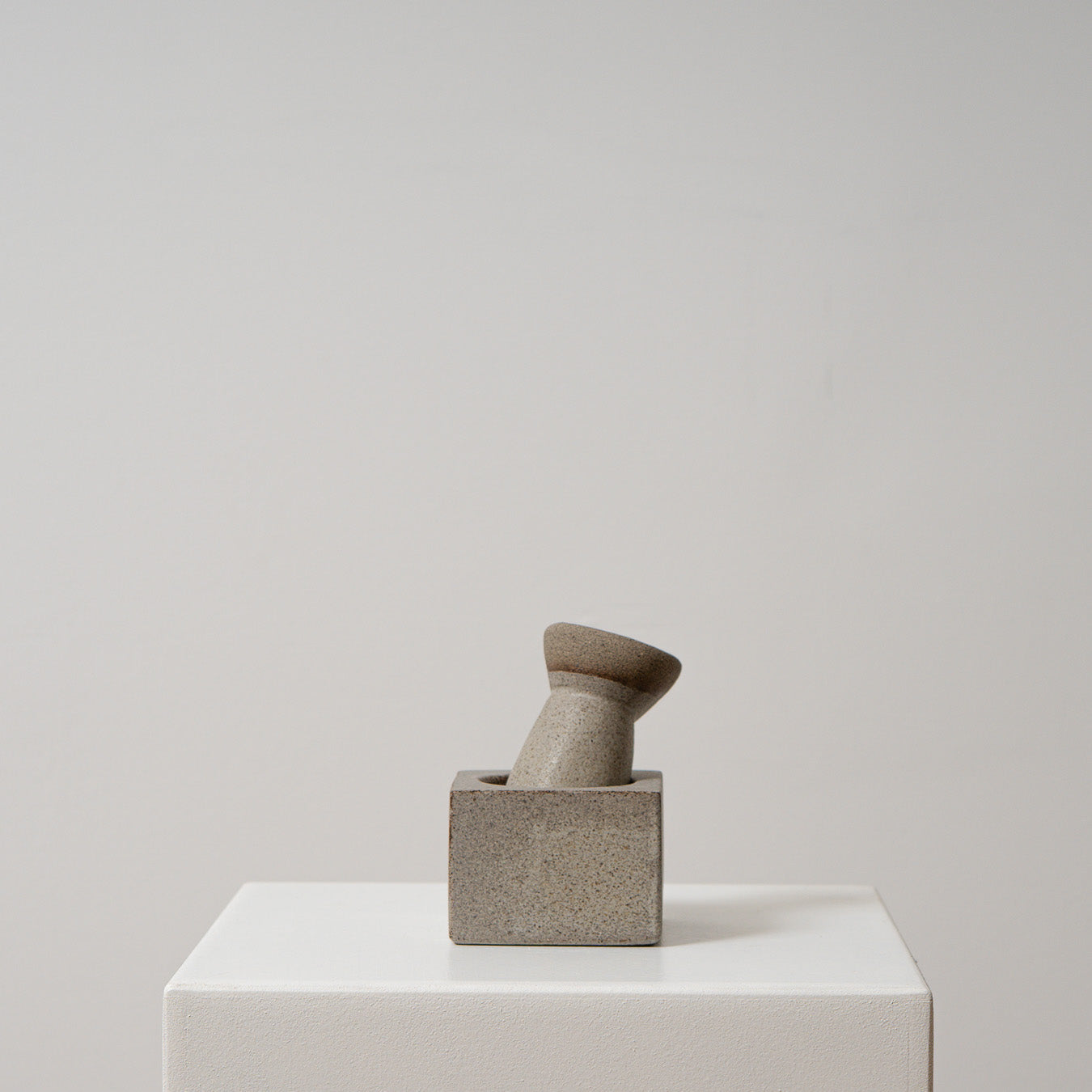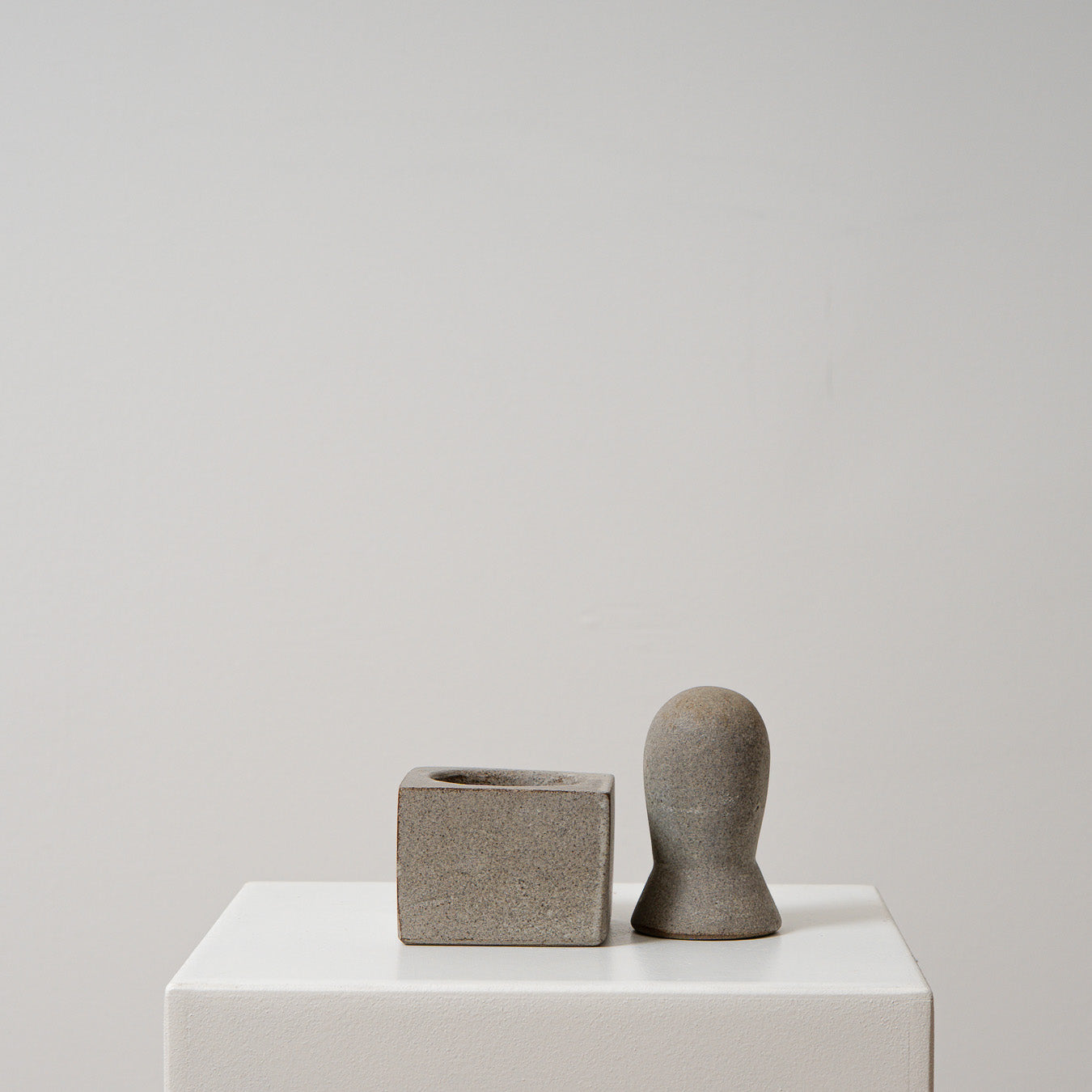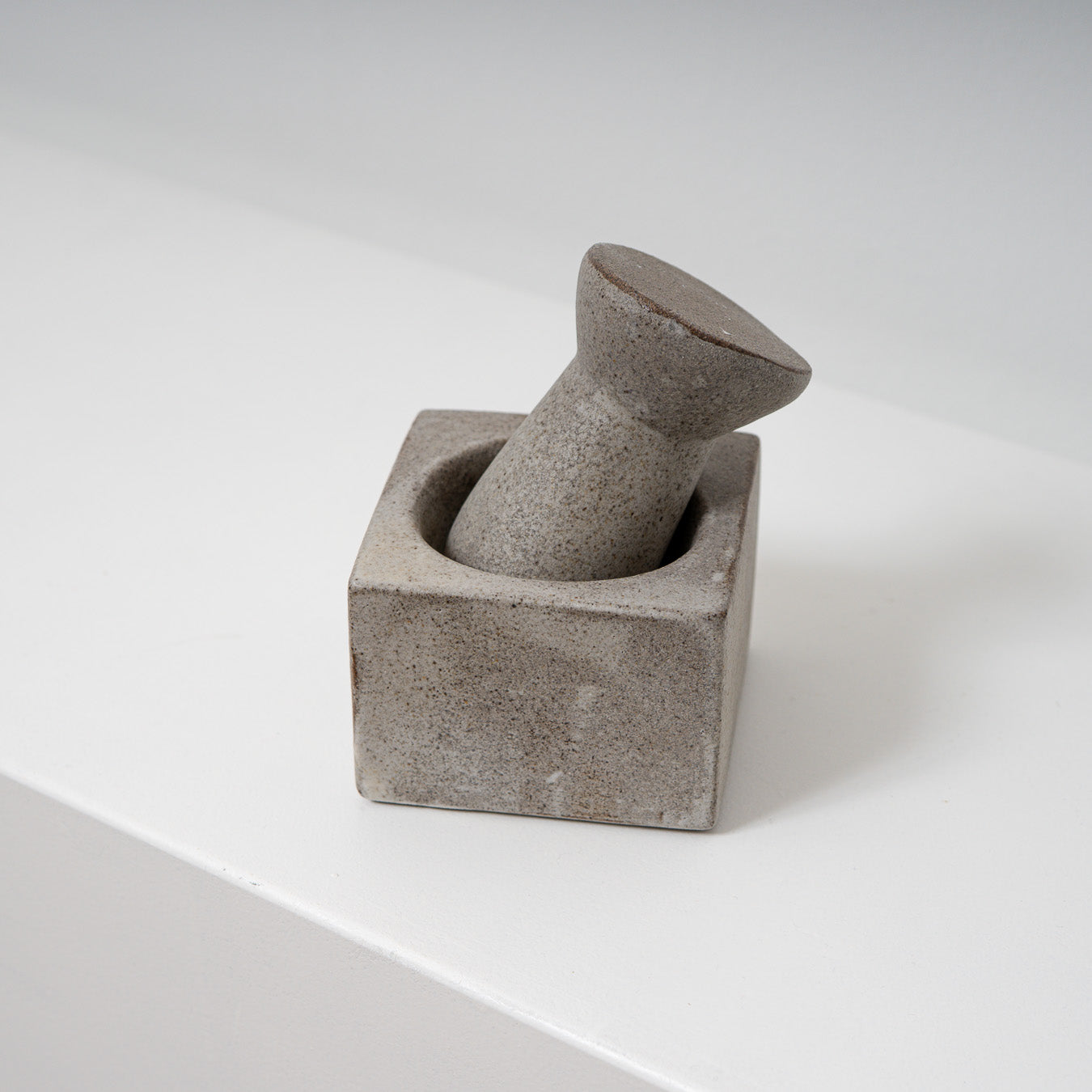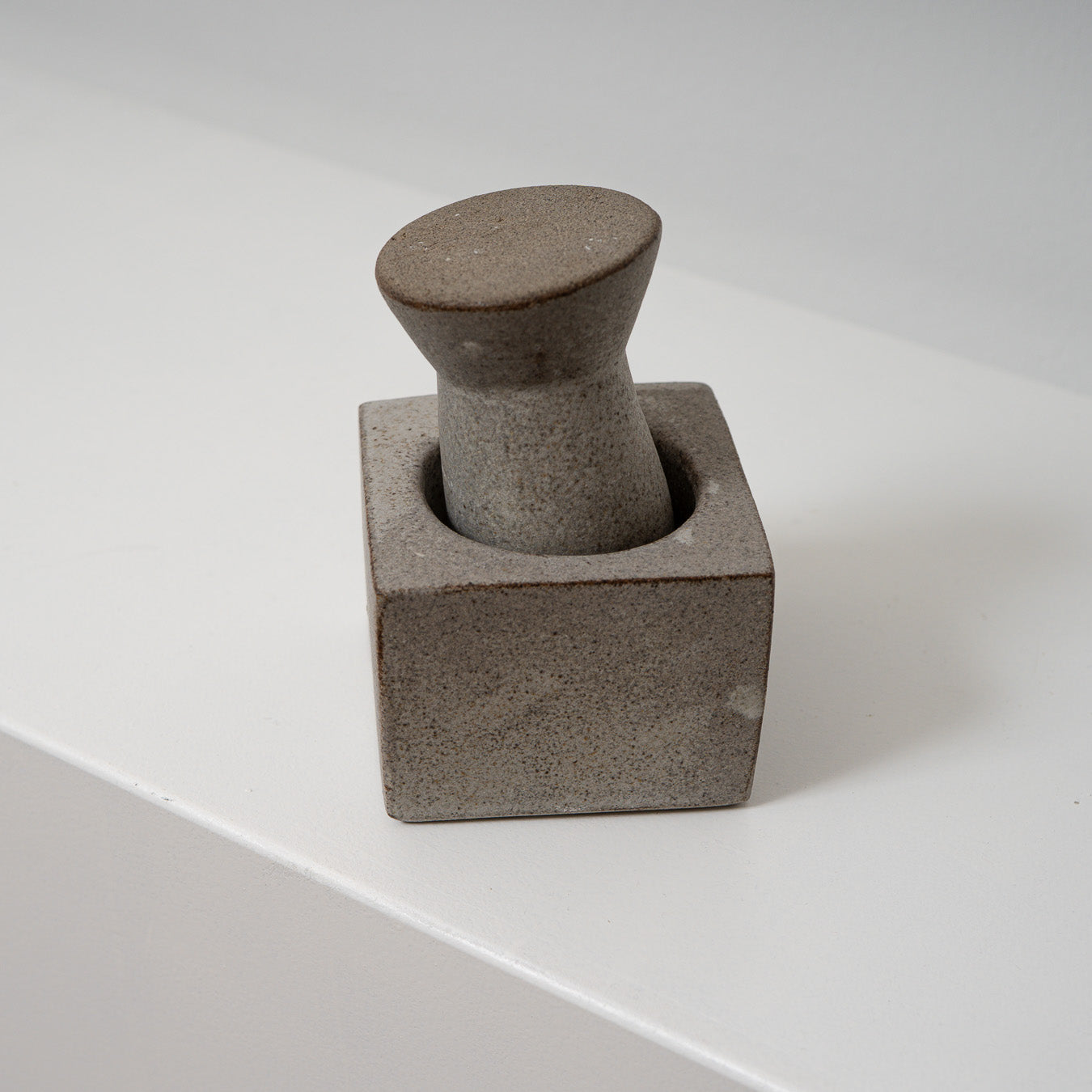 Ein schwerer Mörser, mit einer Schale, die nicht viel größer ist als der Stößel. Der Stößel ist oben flach und abgerundet und kann dadurch mit der Handfläche und ein paar Drehungen einfach bedient werden. Ohne viel Kraftaufwand lassen sich sehr schnell trockene Gewürze, wie Pfeffer, Senfsamen und Chili zermahlen. Inspiriert von der Küche Ottolenghis, ein Stück dass man sehr schnell schon allein wegen der Düfte nicht mehr in der Küche missen möchte.