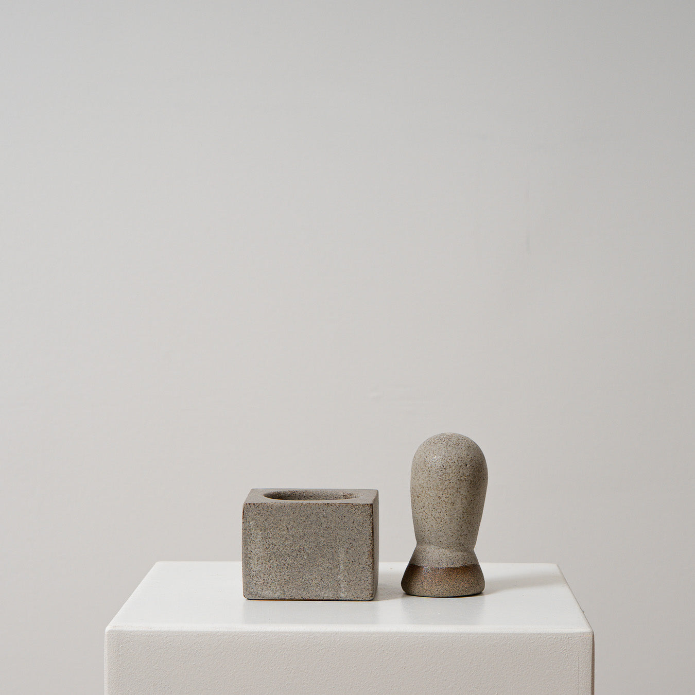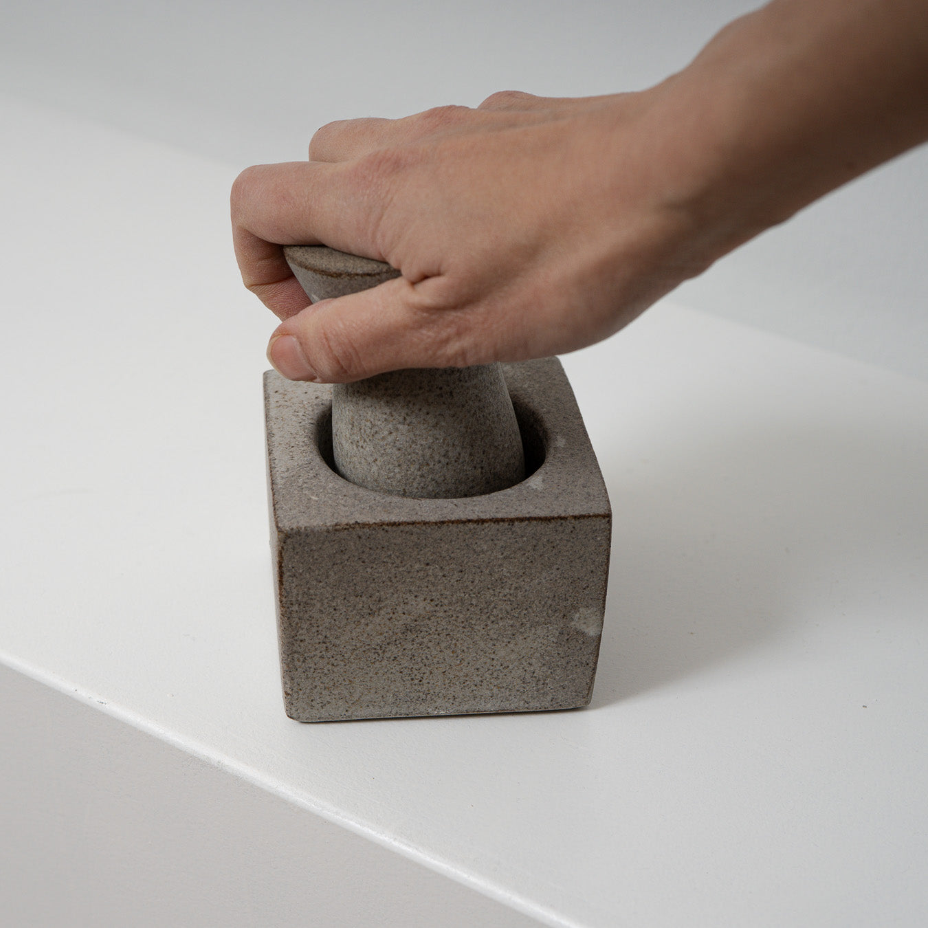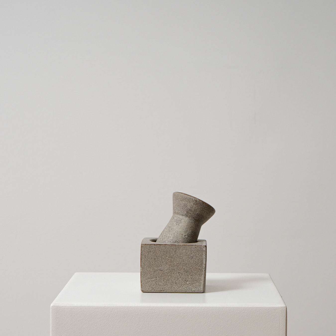 Ein schwerer Mörser, mit einer Schale, die nicht viel größer ist als der Stößel. Der Stößel ist oben flach und abgerundet und kann dadurch mit der Handfläche und ein paar Drehungen einfach bedient werden. Ohne viel Kraftaufwand lassen sich sehr schnell trockene Gewürze, wie Pfeffer, Senfsamen und Chili zermahlen. Inspiriert von der Küche Ottolenghis, ein Stück dass man sehr schnell schon allein wegen der Düfte nicht mehr in der Küche missen möchte.
