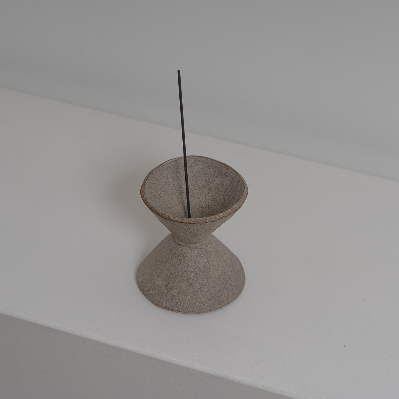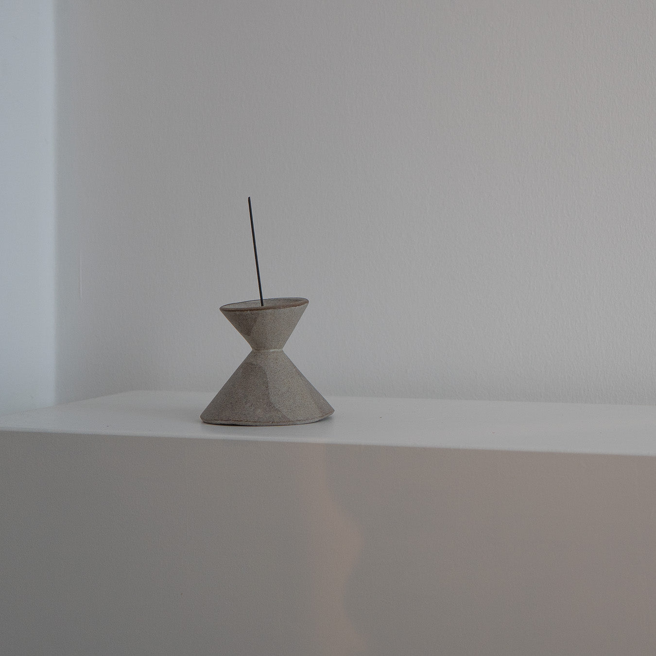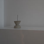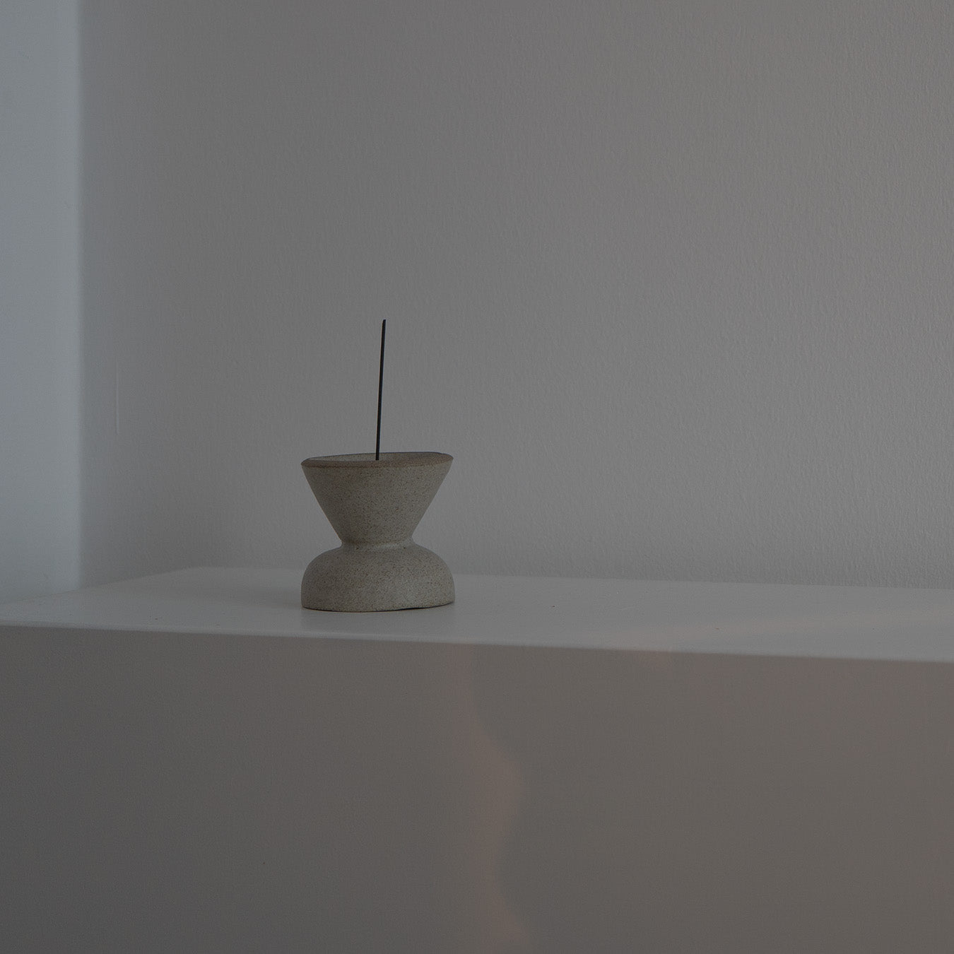 KONO ist ein kleiner keramischer Doppelkegel, der gedreht zwei verschiedene Anwendungen ermöglicht. Eine Seite hält Räucherstäbchen präzise, die andere lässt sich für Räucherkegel nutzen.