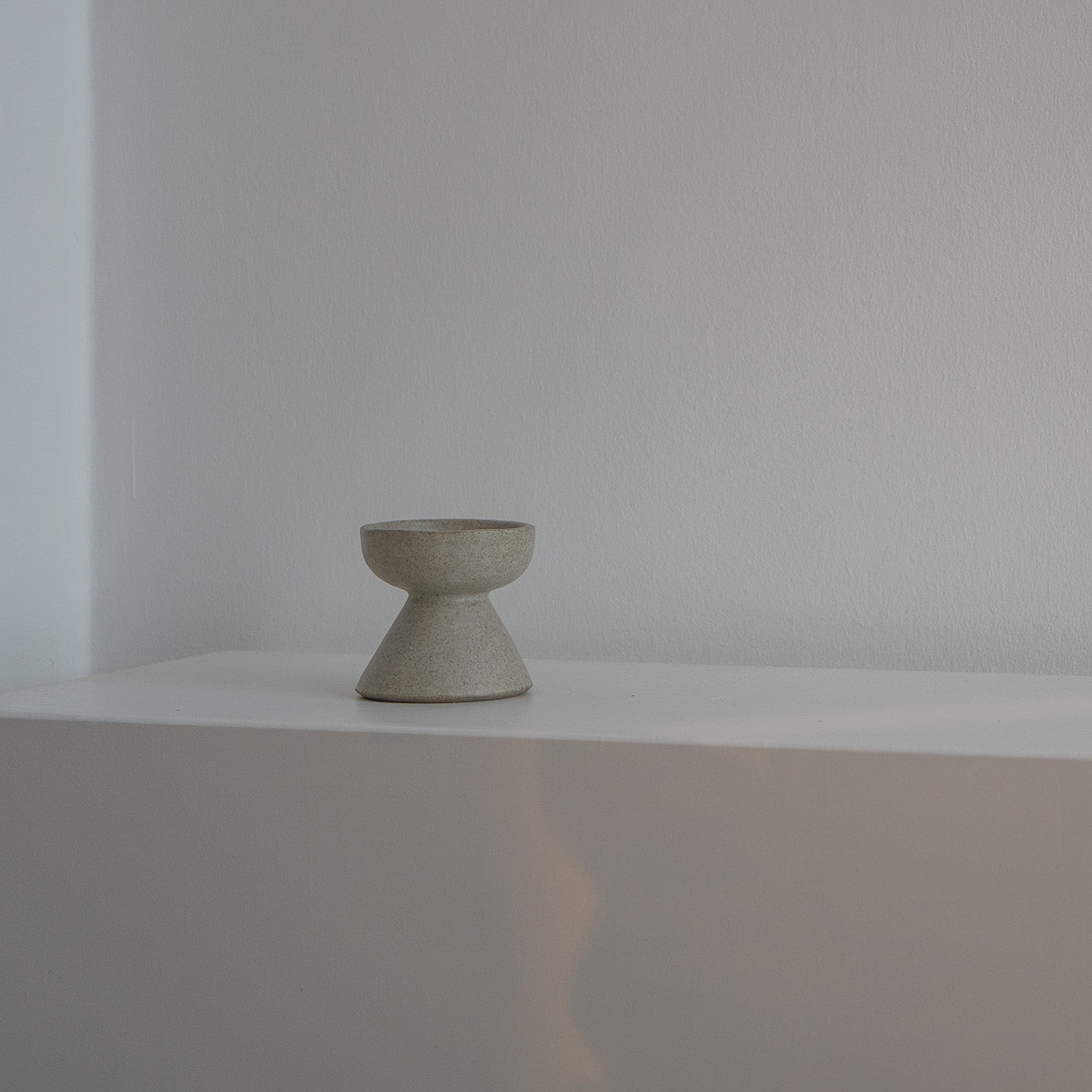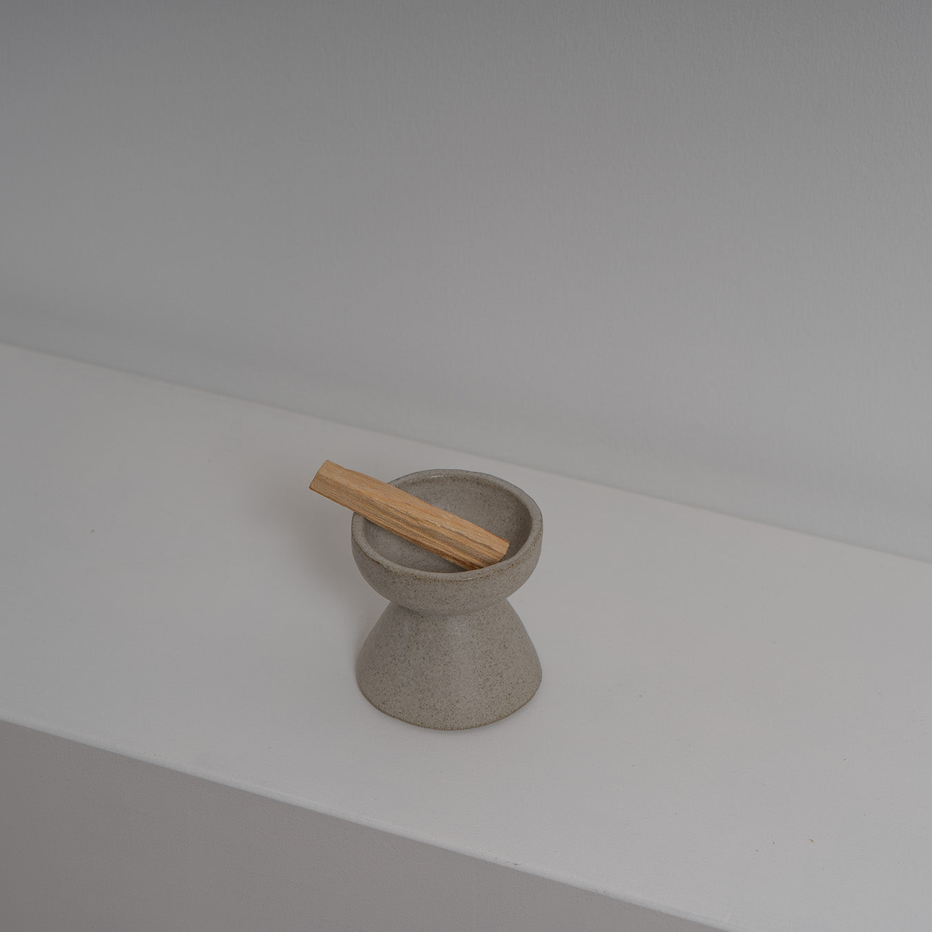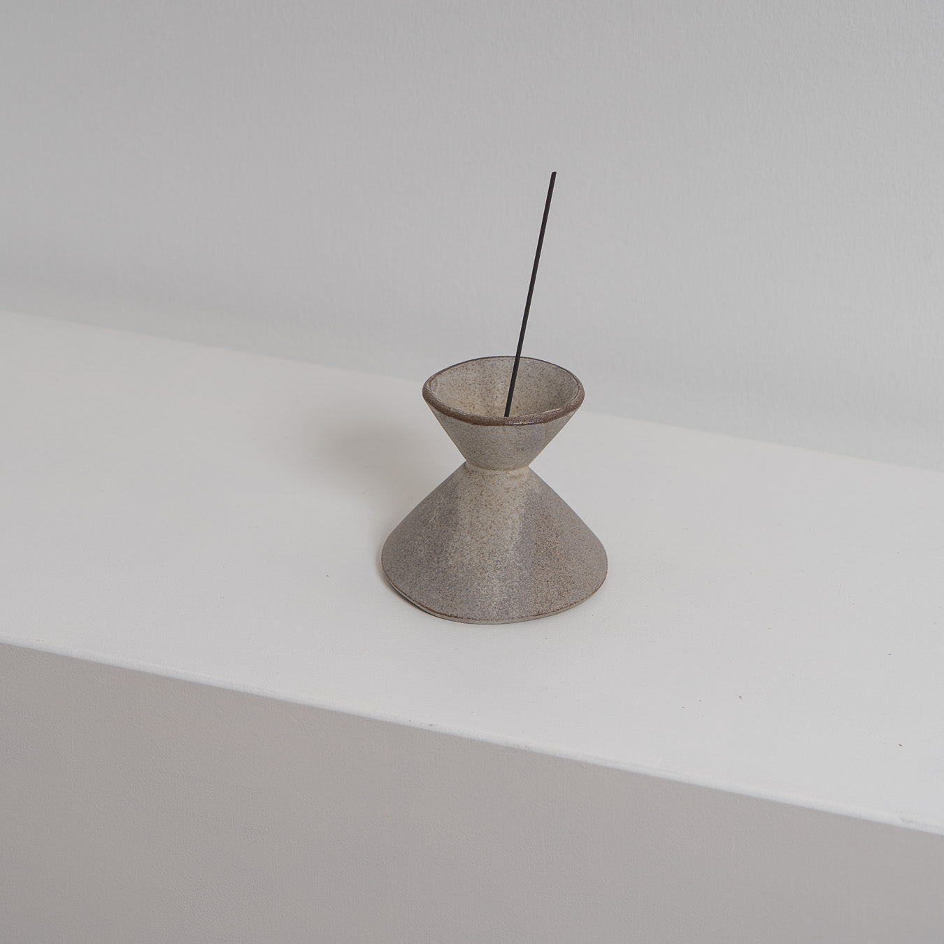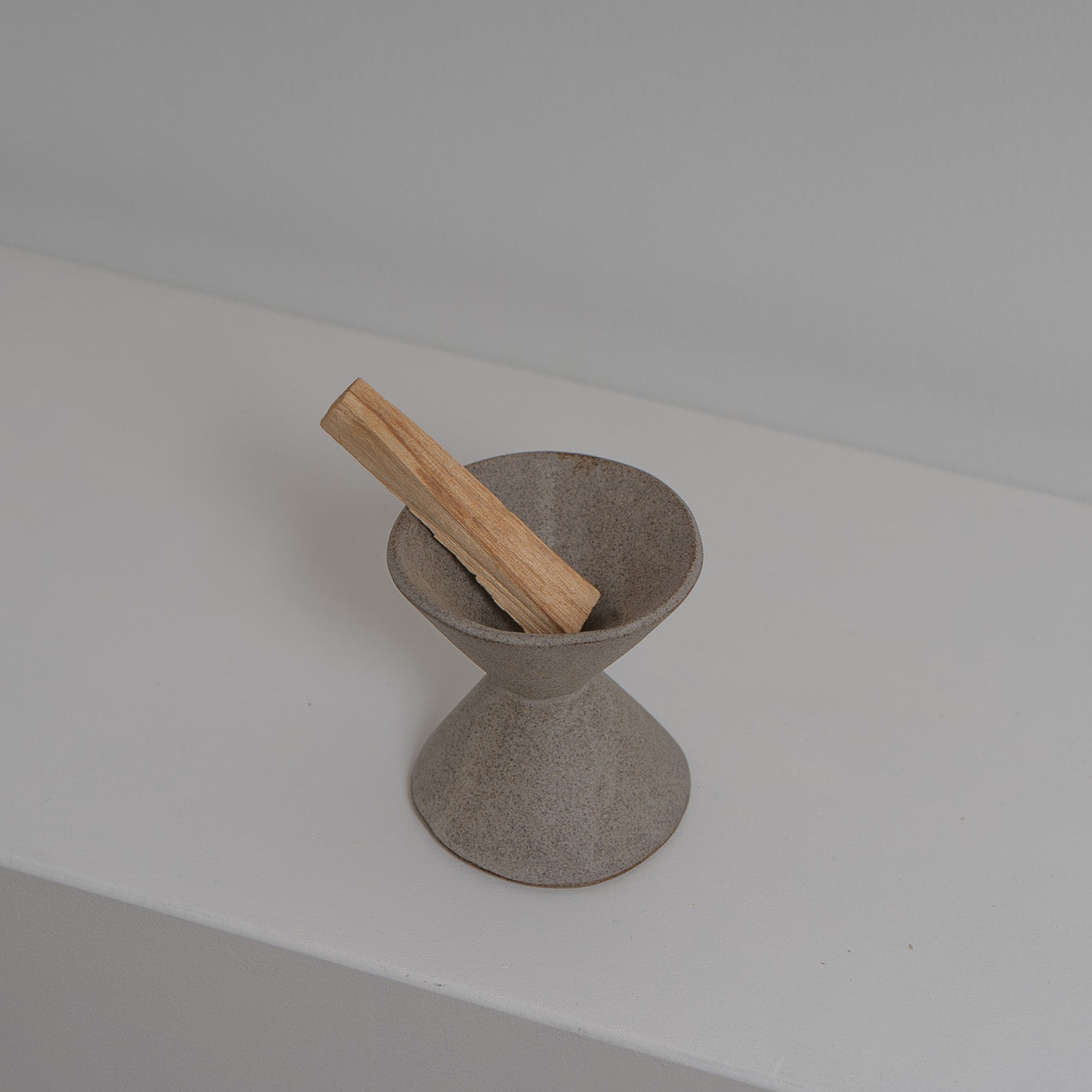 KONO ist ein kleiner keramischer Doppelkegel, der gedreht zwei verschiedene Anwendungen ermöglicht. Eine Seite hält Räucherstäbchen präzise, die andere lässt sich für Räucherkegel nutzen.